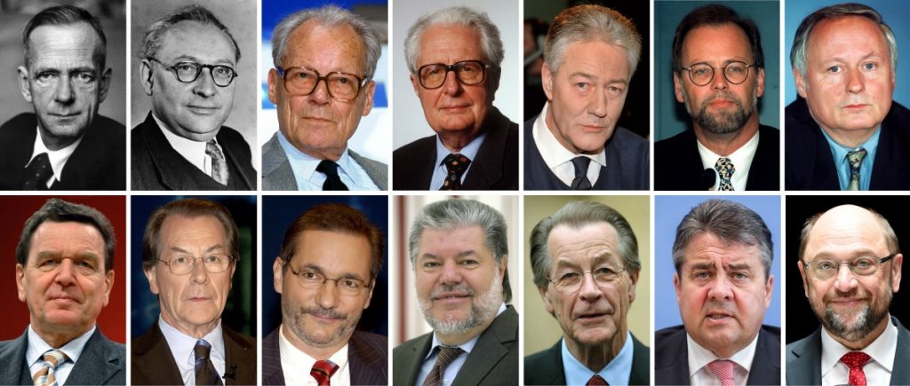 An der Spitze der SPD standen seit 1946 als Vorsitzende: (oben, l-r) Kurt Schumacher (05/1946 – 08/1952), Erich Ollenhauer (09/1952 – 12/1963), Willy Brandt (02/1964 – 06/1987), Hans-Jochen Vogel (06/1987 – 05/1991), Björn Engholm (05/1991 – 05/1993), Rudolf Scharping (06/1993 – 11/1995), Oskar Lafontaine (11/1995 – 03/1999), (unten l-r) Gerhard Schröder (04/1999 – 03/2004), Franz Müntefering (03/2004 – 11/2005), Matthias Platzeck (11/2005 – 04/2006), Kurt Beck (05/2006 – 09/2008), erneut Franz Müntefering (10/2008 – 11/2009), Sigmar Gabriel (11/2009 – 03/2017), Martin Schulz (03/2017-02/2018). Auf dem Foto fehlt die amtierende SPD-Chefin Andrea Nahles.