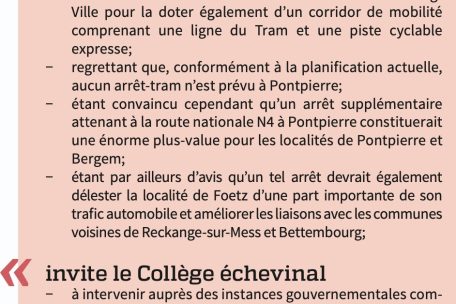 Ein Jahr später stellte sich heraus, dass sowohl beim neuen „Plan d’aménagement général“ (PAG) als auch bei der Mobilitätsstudie der Gemeinde Monnerich das Projekt schnelle Tram nicht berücksichtigt wurde. Unter dem Titel: „Mobilitätskonzept – CSV und DP blockieren Fortschritt in Monnerich“ machte die LSAP in der Dezember-2021-Ausgabe der Tribune auf das Thema aufmerksam und hob außerdem hervor, dass zum Nachteil der Einwohner*innen in Steinbrücken keine Haltestelle vorgesehen sei. Im Vorlauf zu diesem Artikel hatte die LSAP bereits in der Gemeinderatssitzung vom 18. Juni 2021 einen Antrag eingebracht, um den Schöffenrat aufzufordern, dringend mit den zuständigen staatlichen Behörden und den Nachbargemeinden Kontakt aufzunehmen, mit dem Ziel, eine Tramhaltestelle in Steinbrücken in die Planung aufzunehmen. CSV, DP und Grüne stimmten damals im Gemeinderat gegen diesen Antrag.