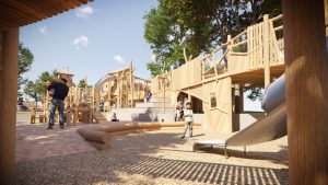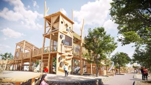 Ein besonderes Highlight wird der neue Schaukelbereich. Durch die Anordnung der Schaukeln in Form eines Ovals können die Besucher sich selbst beobachten, während sie auf den unterschiedlichen Schaukeln hin und her schwingen. Die Spielgeräte und Konstruktionen werden allesamt aus pflegeleichtem Robinienholz angefertigt. Die zwei Türme und die Rutschen sind über die Rampen leicht zugänglich und gewähren auf bis zu 3,80 Meter Höhe eine Aussicht über den Park.