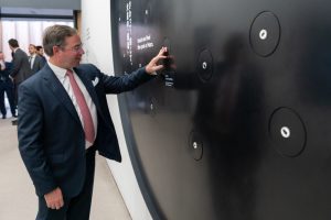 André Hansen, zuständiger Kommissar für die Expo 2025, und Erbgroßherzog Guillaume lassen die Bilder von Luxemburg auf sich wirken