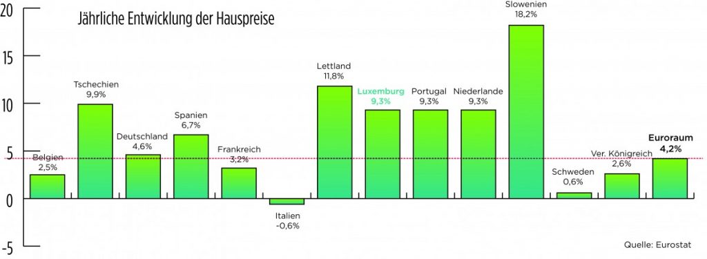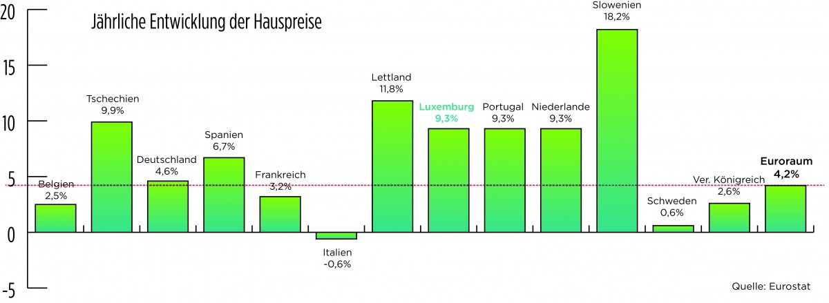 Die gute Nachricht: Wir sind nicht allein. Die schlechte: Das verringert das Problem nicht. In nahezu ganz Europa steigen die Immobilienpreise deutlich. Um 4,2 Prozent im Jahr. Das hat das Statistische Amt der Europäischen Union (Eurostat) auf der Grundlage des Hauspreisindex gemessen. Anders als manche wohl vermuten befindet sich Luxemburg nicht an der Spitze der Statistik. Es steht nicht einmal in den Top drei. Die größten Preissteigerungen im Jahresvergleich bei Immobilien gab es in osteuropäischen Staaten: in Slowenien (plus 18,2 Prozent), Lettland (plus 11,8 Prozent) und Tschechien (plus 9,9 Prozent). Erst auf Rang vier befindet sich das Großherzogtum mit einer Jahres-Teuerung von 9,3 Prozent (siehe Grafik).