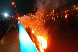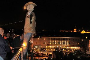 Auf den letzten Metern in Richtung Brückenmitte, wo die Strohpuppe angezündet wird, ertönen die Klänge des deutschen Volkslieds „Muss i denn, muss i denn zum Städtele hinaus“.