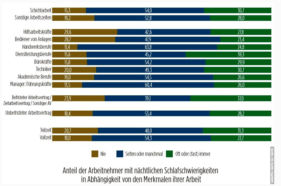 Bei 40 Prozent der chronischen Formen von Schlaflosigkeit spielt die Arbeit eine Rolle (Léger, 2009), insbesondere die Art der Arbeit und die Arbeitsbedingungen (vgl. oben stehende Grafik).