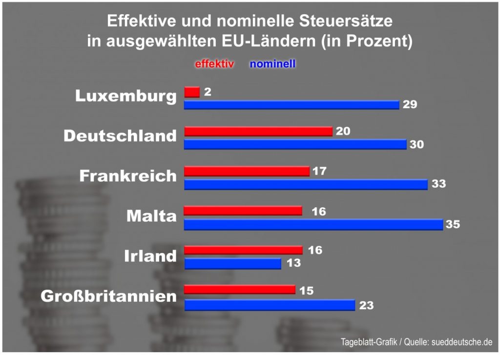Am stärksten sei die Abweichung bei Luxemburg, wo der gesetzliche Steuersatz für Unternehmen eigentlich 29 Prozent beträgt. Doch die Grünen kommen der SZ zufolge auf eine ganz andere Zahl, nämlich lediglich zwei Prozent.