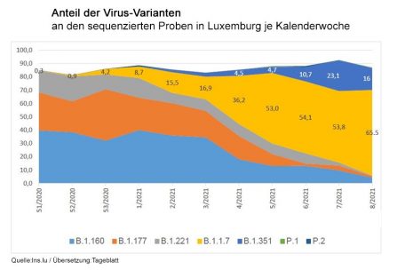 Damit wird in Luxemburg ein ähnlicher Trend wie auch in Deutschland beobachtet. Dort hatte das Robert-Koch-Institut (RKI) am Mittwoch erklärt, dass vergangene Woche rund 55 Prozent der in Laboren untersuchten Proben auf B.1.1.7 zurückgingen.