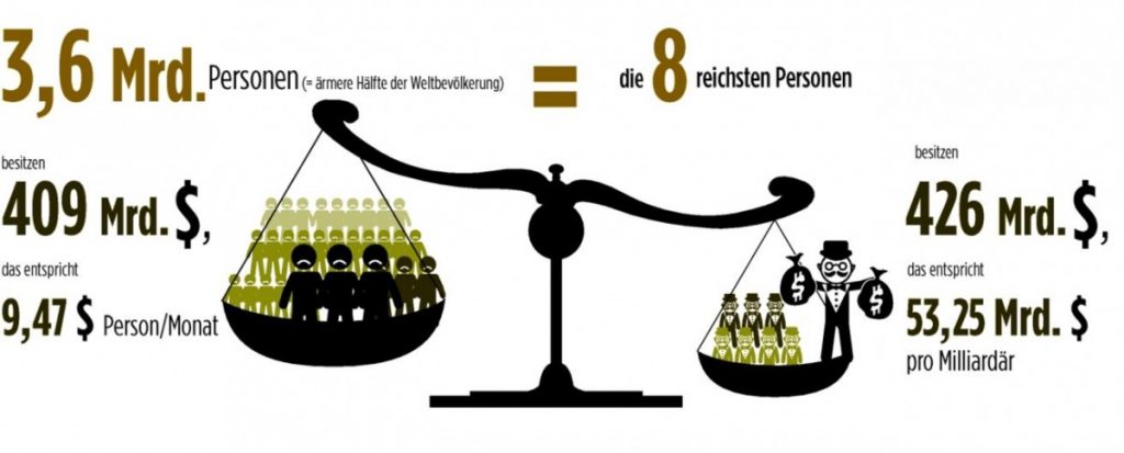 Während nach einem Oxfam-Bericht 2015 noch 62 Milliardäre so viel Vermögen besaßen wie die ärmere Hälfte der Menschheit, also rund 3,6 Milliarden Menschen, zusammen, waren es 2016 nur noch acht Personen. Zu denen gehörten neben Bill Gates mit 84 Milliarden, Zara-Gründer Amancio Ortega mit 67 Milliarden und Warren Buffet mit 60,8 Milliarden US-Dollar auch der Mexikaner Carlos Slim mit 50 Milliarden, Amazon-Gründer Jeff Bezos (45,2 Milliarden), Mark Zuckerberg (44,6 Milliarden), Larry Ellison (43,6 Milliarden) und New Yorks Ex-Bürgermeister Michael Bloomberg (43,3 Milliarden).