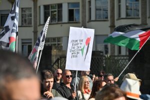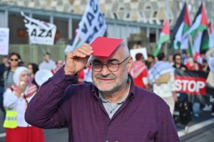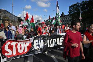 Viele Menschen, die der Demonstration der Aufforderung gefolgt sind, palästinensische Fahnen zu schwenken, um eine „rote Linie“ gegen den Völkermord in Gaza zu bilden, sind nicht zum ersten Mal dabei. Sie sind schon zigmal für die Sache der Palästinenser auf die Straße gegangen. Andere wie Nicolas sind neu dabei. Sie haben ihre Familien mitgebracht. „Das schöne Wetter hat eine gute Rolle gespielt“, sagt er. Etliche Demonstranten halten „roten Karten“ hoch. Rote Karten für Israel und gegen den von der israelischen Regierung begangenen Genozid, gegen das Aushungern und Bombardieren der palästinensischen Bevölkerung. Von der Hamas, der Terrororganisation, die am 7. Oktober vor zwei Jahren Israel überfiel und ein Massaker unter Israelis verübte und Geiseln nahm, ist heute nicht die Rede.