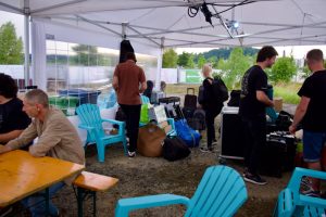 Im Backstage füllen sich langsam, aber sicher die Künstlerzelte. Hier bereiten sich unter anderem De Läb, Mutiny on the Bounty und der legendäre Mambo Schinki auf ihren Auftritt vor. Es herrscht geschäftiges Treiben, während die Künstler ihre Instrumente stimmen, letzte Absprachen treffen und ihr Equipment ordnen.