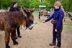 Was nach einem skurrilen Detail klingt, ist Teil eines erprobten Konzepts: Beim sogenannten Target-Training lernen Tiere, bestimmte Gegenstände mit der Nase zu berühren – zum Beispiel eine Fliegenklatsche. Das stärkt Konzentration, Beweglichkeit und Vertrauen. „Wir trainieren nichts, was unnatürlich ist. Wir helfen den Tieren einfach dabei, das zu zeigen, was sie ohnehin können“, sagt Hagemann.