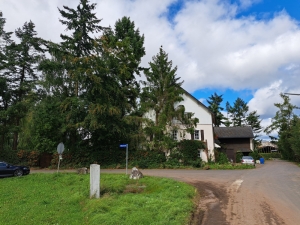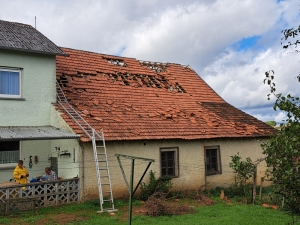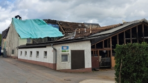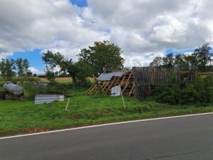 Das Tageblatt wagt einen weiteren Ansprechversuch, als eine der Arbeitenden sich vom Garten in Richtung Straße bewegt. Sie ist Landwirtin, die Bewohnerin des hinter ihr liegenden Hauses. Auch sie will sich zunächst nicht zu dem Schreckensabend und dem schweren Morgen danach äußern. Nach kurzer Zeit berichtet die Frau dann doch von der Windhose, die als Erstes durch ihren Garten zog. Dabei wurde unter anderem ein großer Baum beschädigt, der sogar jetzt noch das ohnehin hohe Bauernhaus überragt. Dann zeigt sie mit ihrem Zeigefinger in Richtung eines Stalles, der in zirka 30 Metern Entfernung auf der gegenüberliegenden Straßenseite schräg hinter dem Garten liegt. Das Ganze habe nur einen kurzen Augenblick gedauert, dann sei es schon vorbei gewesen – allerdings mit erheblichen Folgen.