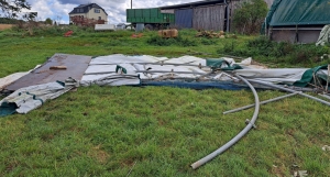 Die zerlegte Rundbogenhalle ist einige Meter hinter dem Ziegengehege gelandet, von wo aus man Aussicht auf ein weiteres mitgenommenes Haus erhält: ein umgeworfener Zaun, überall verteilte, zersplitterte orangefarbene Dachziegel und umgeknickte Obstbäume.