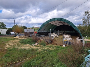 Auch im kleinen Nachbardorf Hommerdingen hat die Windhose ihre Spuren hinterlassen. Diese Ortschaft traf es zuerst. Eines der Opfer ist ein kleiner einheimischer Betrieb, der Ziegenkäse verkauft. Vor der Ladentür kreuzt das Tageblatt zufällig eine Frau in blauer Schürze, die sich dazu bereit erklärt, uns etwas herumzuführen. Sie präsentiert den Hinterhof des Betriebs und zeigt auf eine leere Stelle neben einem mit einer grünen Plane bedeckten Ziegengehege. Daneben habe bis gestern noch eine ähnliche Konstruktion gestanden. Sie wurde mitsamt der Heringe komplett aus dem Boden gerissen und weggefegt.