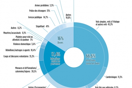 Zum besseren Verständnis: Die Polizei unterscheidet zwischen Fällen und Vergehen, da ein einzelnes Verbrechen gleich mit mehreren Strafverstößen geahndet werden kann. Einer Person, die mit Drogen erwischt wird, kann man beispielsweise Besitz, Konsum und den Verkauf dieser Drogen vorwerfen. Ein Fall, drei Vergehen. Letztere werden wiederum den Kategorien „infractions contre les biens“ (Eigentumsdelikte), „infractions contre les personnes“ (Straftaten gegen Personen) oder „Divers“ zugeteilt, in welcher u.a. Drogendelikte oder nächtliche Ruhestörungen erfasst werden.