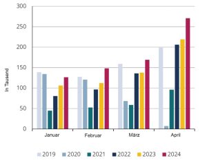 Das Ergebnis unserer „Mini-Umfrage“ bringt andere Ergebnisse als das, was Statec für das gesamte Land herausgefunden hat. Um 15 Prozent seien die Übernachtungszahlen zwischen Januar und April 2024 im Vergleich zu 2023 gestiegen, sagen die Statistiker. Das zeigt auch die im letzten „Konjunktur Flash“ vom 22. Juli 2024 veröffentlichte Grafik. Das sind sogar fünf Prozent mehr als EU-weit, heißt es in der Analyse weiter.