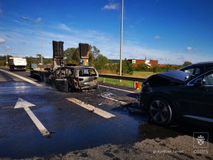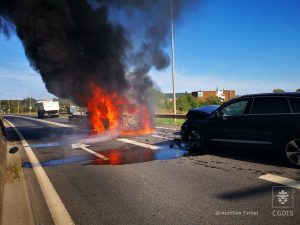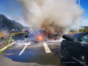 Ein Auto ist am Freitag (6.9.) gegen 10.40 Uhr am Ende der A13 in Richtung Petingen vor dem Kreisverkehr „Biff“ in Flammen aufgegangen. Zuvor war das Auto auf einen Lkw-Anhänger aufgefahren (UPDATE: Bitte beachten Sie, dass sich hier die Erkenntnislage geändert hat). Zwei nachfolgende Autos konnten nicht rechtzeitig angehalten werden und fuhren ebenfalls auf.
