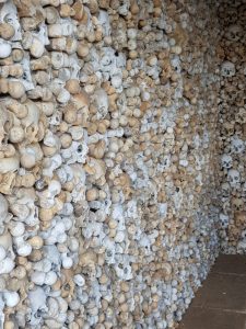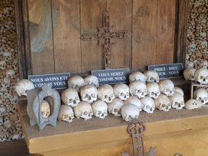 1890 hatte der Friedhofswärter Pierre-Nicolas Constant Motsch rund 6.000 Totenköpfe und andere Knochen aus Massengräbern des Friedhofs zusammengetragen und fein säuberlich aufgestapelt. Das medizinische Institut von Marville war jahrzehntelang die (vor)letzte Station der Leprakranken der Region, was die Masse der Gebeine erklärt. Der älteste Totenkopf soll aus dem 16. Jahrhundert stammen. 29 von ihnen fasste Motsch in Holzkisten, die an kleine Wanduhren erinnern, ein. Jedenfalls schuf der 1902 verstorbene Friedhofswärter so ein Denkmal für die Toten, das Besuchern einen Schauer über den Rücken laufen lässt. Zumal es mit der eingangs zitierten Inschrift „geschmückt“ ist: „Nous avons été comme vous. Vous serez comme nous. Priez Dieu pour nous.“