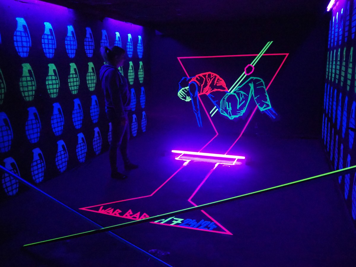 Chiara Dahlem hat sich persönlich für einen Raum im Untergeschoss des Gebäudes entschieden. Der Titel „War Bar 7/7 24/24“ lässt ahnen, um was es bei ihrem Kunstwerk geht. „Der Grundgedanke war, dass wir uns am Krieg in Syrien ergötzen. Vor Ort hat sich seit Jahren nichts geändert und wir schauen uns das Ganze nur in den Medien an“, erklärt Chiara. Mit Graffiti, Tape und Schwarzlicht hat die Künstlerin die Umrisse eines Mädchens geformt, das in einem Martiniglas von einem Zahnstocher durchbohrt wird. „Während andere jeden Tag im Krieg überleben müssen, gehen wir in Bars und feiern. Das Bild zeigt quasi den Schrecken des Krieges im Kontrast zum Luxus unseres Lebens“, so Chiara. Den Raum hat sie nicht zufällig ausgewählt: „Hier drin ist es bedrückend und unangenehm, die erste Reaktion des Körpers ist es, zusammenzuzucken. Das vermittelt die Message sehr gut.“ Auch für die Künstlerin selbst war die Arbeit im feuchten Keller nicht immer angenehm: „Anfangs hat es reingeregnet. An den Wänden hat durch die Feuchtigkeit das Tape nicht gehalten, also musste ich mit einer Leinwand arbeiten. Das hier ist ganz anders als im Atelier, wo es bequem und geheizt ist. Hier muss man sich andauernd an die Bedingungen und den Raum anpassen.“