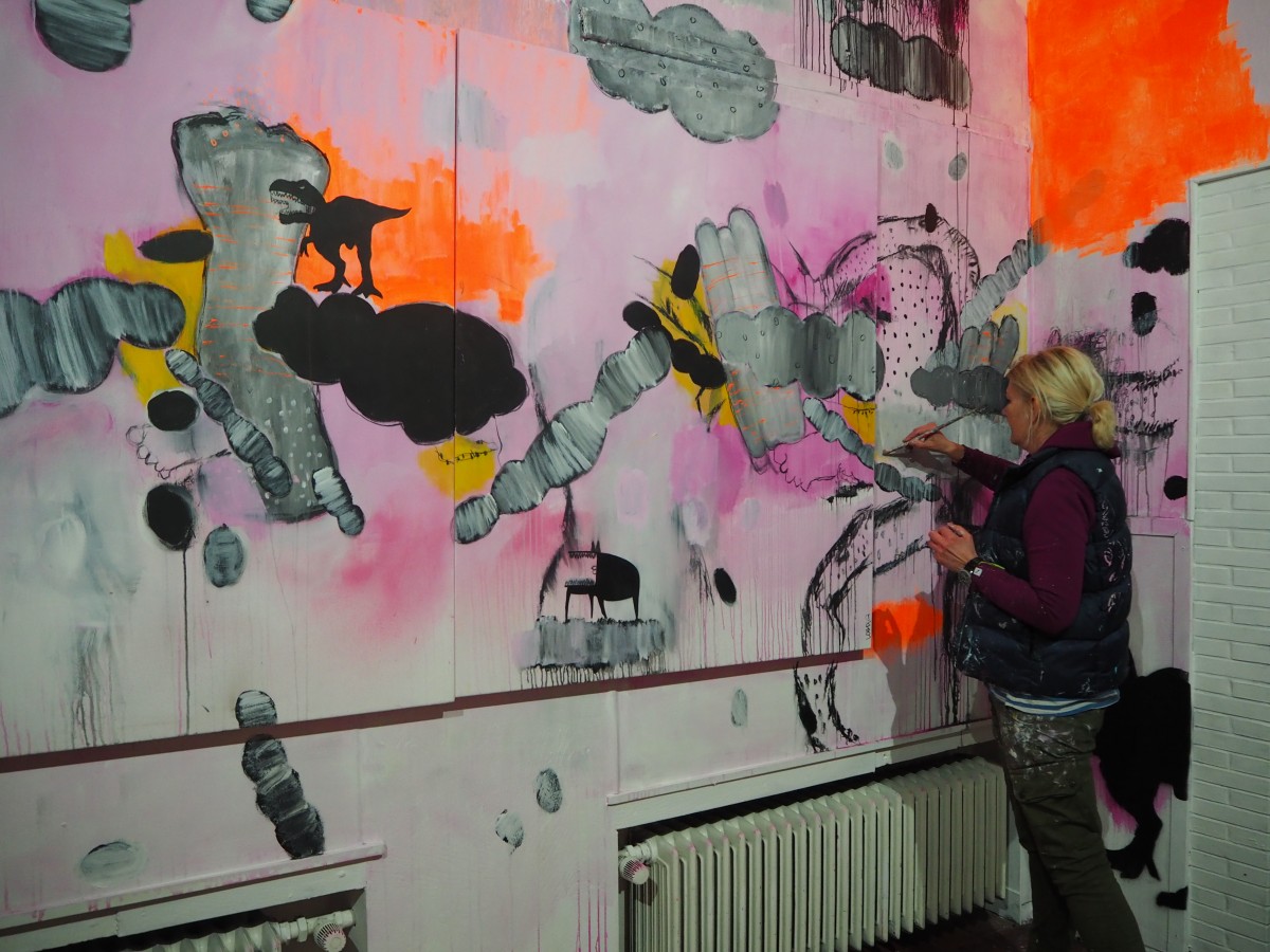 Wenig Ton in Ton sieht es in einem der Räume im Erdgeschoss aus. Hier pinselt seit einiger Zeit Christiane Lohrig. Beim Werk der Saarbrücker Künstlerin dreht sich alles um den Dschungel, Dinosaurier und Chaos. Die Motive erstrecken sich über zwei Leinwände und entfalten sich über deren Rahmen hinaus auf Mauer und Decke. „Hier kann ich mich voll austoben, ich habe Platz und bin weniger eingeschränkt als normalerweise“, erklärt Christiane. Doch die scheinbar unendlichen Möglichkeiten im Raum des alten Gebäudes haben auch ihre Tücken, wie die Künstlerin verrät: „Ich muss immer wieder drei Meter von der Wand wegtreten, um zu sehen, ob das, was ich da mache, überhaupt passt. Es macht Spaß, ist aber auch schwierig.“ Wie ihr Kunstwerk schließlich aussieht, ist bei Christiane Stimmungssache: „Wenn ich nächste Woche wieder herkomme, bin ich vielleicht voll progressiv drauf oder eher ruhig gestimmt. Das kann viel ausmachen. Hauptsächlich muss ich aber aufpassen, dass ich nicht alles vollklatsche.“