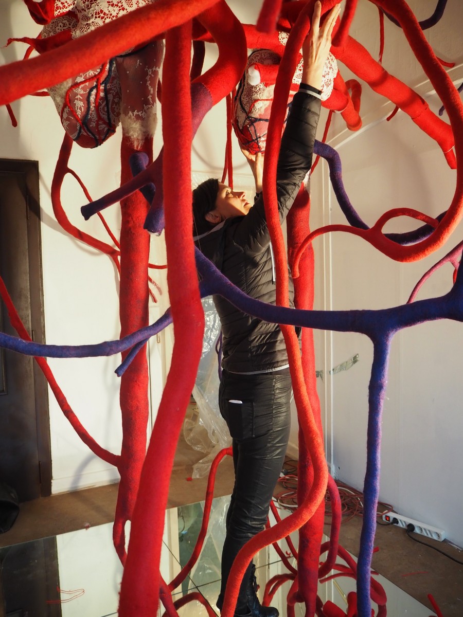 Gegenüber von Katarzynas Werk wuchern Eleonora Pastis Blutgefäße und Herzen aus Filz. Die Installation soll die Liebe eines Pärchens darstellen, wie die Künstlerin verrät: „Da es sich hier um ein ehemaliges Familienhaus handelt, habe ich direkt daran gedacht, dass dies einer der typischen Orte ist, an denen zwei Menschen als Paar zusammenleben können. Das Gebäude ist zwar verlassen, aber eigentlich zeigt es doch, dass es egal ist, wo man wohnt, um sich zu lieben. Eine kleine Hütte genügt.“ Im Zusammenspiel mit Spiegeln unterschiedlicher Größe ist das kleine Zimmer von den Adern und Venen durchwachsen und versetzt den Betrachter direkt ins Werk hinein. Ein Unendlichkeitseffekt, der nicht so einfach zu erreichen war. „Die Challenge bei diesem Projekt war es, einen komplett leeren Raum zu füllen. Im Atelier ist man allein, wenn man da Fehler macht, sieht es keiner. Hier im Haus sind noch viele andere Künstler, daran muss man sich erst gewöhnen“, so Eleonora.