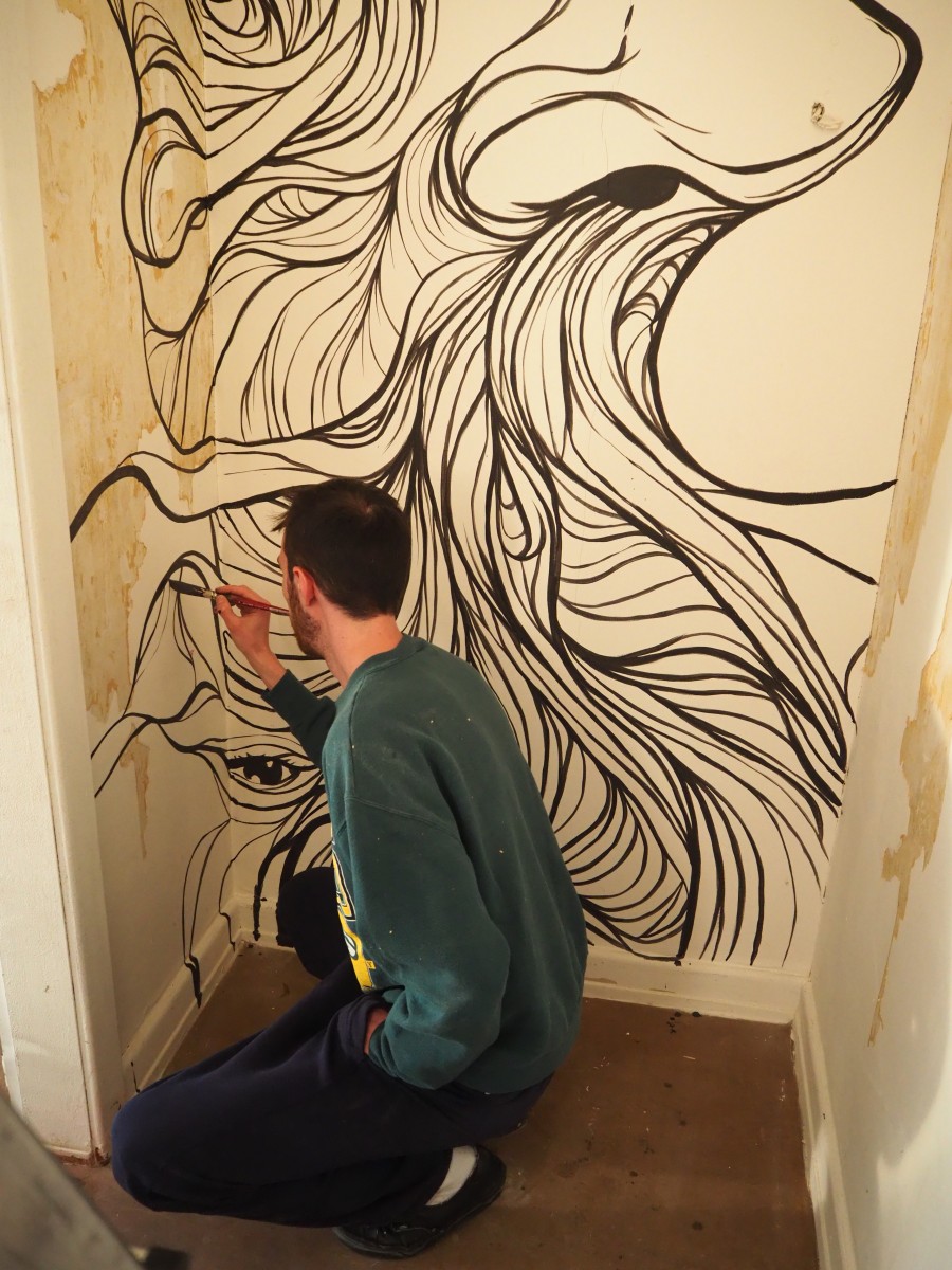 Organisch geht es im Flur des ersten Stockes weiter. Hier pinselt der gelernte Designer Lionel François wellenförmige Linien an die Wände, alles in schwarz-weiß. „Das Leben ist doch eigentlich wie ein Strich. Jeder muss seinen Weg finden. Ich arbeite allgemein gerne mit organischen Linien, da ich mich sehr mit der Natur verbunden fühle“, erklärt Lionel. Inspiration findet er teilweise bei seinem Vater, der ebenfalls künstlerisch veranlagt ist, generell ist Lionel aber ein Autodidakt. Auch bei seinen Werken hat er eine ganz eigene Herangehensweise: „Das kommt alles spontan, je nachdem wie ich mich in dem Moment fühle. Ich arbeite auch nicht gerne mit Farben, das Leben ist bunt genug, da muss man nicht noch mehr Farbe benutzen.“ Seine Werke stellt der Designer eher selten bis gar nicht aus, er bewegt sich lieber „underground“ und skizziert seine Ideen mit dem Bleistift von Zuhause aus. Projekte wie „Lankelz“ sind da genau das Richtige, denn hier sind dem kreativen Ausdruck der Künstler keine Grenzen gesetzt.