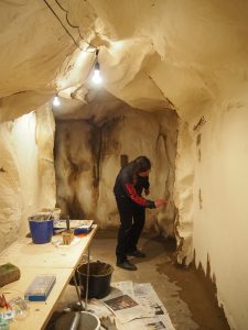 Marc Soisson ist selbst ein „Lallenger Bouf“, seine Kindheit hat er knapp 50 Meter entfernt vom „Lankelz“-Gebäude verbracht. Sein Kunstwerk im Untergeschoss des alten Hauses trägt ebenfalls die Handschrift des Escher Ortsteils, denn hier präsentiert er wortwörtlich einen Kubikmeter Lallingen – direkt aus seinem Garten. Zwischen Erde und Graswurzeln versteckt sich so manches Fundstück früherer Tage in der Ausgrabung – der Boden als Zeitzeuge also. „Hauptsächlich habe ich Minett- und Sandstein gefunden, dann noch Betonreste, Schlacken und einige Keramikscherben aus den 30er und 50er Jahren. Neben einem Clay-Pipe-Fragment war meine interessanteste Entdeckung allerdings ein Abzeichen der Hitlerjugend“, verrät der Installationskünstler. Seit sechs Wochen schon verwandelt er mithilfe von Pappmaschee und Farbe den Kellerraum in eine unterirdische Grotte. Die gefundenen Objekte will Marc später an Fäden von der Decke baumeln lassen. Im Gegensatz zur Arbeit in einem normalen Kunstatelier waren die Bedingungen im Gebäude allerdings nicht immer ideal, wie Marc verrät: „Am Anfang waren es draußen minus zehn Grad. Ich habe noch nie gesehen, wie Lackfarbe friert, bis ich angefangen habe, hier zu arbeiten.“