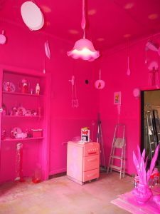 Reiny Rizzi hat für „Lankelz“ ganz besondere Fundstücke ausgegraben. Für ihre „rosa Welt“ in der Küche des ehemaligen Einfamilienhauses hat die Künstlerin Objekte zum Thema Haushalt gesammelt. „Ich habe den halben Troc aufgekauft, die schlimmsten und ältesten Dinge“, so Reiny. Eine Oma-Küche, daran soll der Raum später erinnern. An den Wänden hängen Kunstwerke mit Textil- und Broderieelementen, hier und da werden noch „Stiefmutterpflanzen“ platziert und für das gewisse Etwas sorgen ein paar „creepy“ Objekte, wie Reiny sie nennt. „Ich arbeite viel zu Frauenthemen, deshalb auch rosa als feministische Farbe. Die Idee dahinter ist, dass auch heute noch Hausarbeit als Frauenarbeit angesehen wird. Bei mir ist das zwar anders, dafür ist mein Mann zuständig“, verrät die Künstlerin schmunzelnd. Die Arbeit mit „Cueva“ gefällt ihr persönlich sehr: „Die Projekte bieten dir totale Freiheit. Im alten Haus hier zu arbeiten ist etwas ganz anderes als in einer Galerie. Hier kannst du Sachen außerhalb des Normalen machen.“