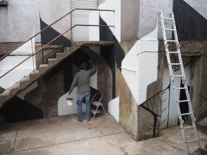 Als Graffer ist es Spike gewohnt, auf unkonventionellen Untergründen zu arbeiten. Die ihm zugeteilte Mauer auf der Hinterseite des Gebäudes ist perfekt für seine urbane Kunst. „Mir gefällt das Grobe, Verlassene, beinahe Hässliche. Deswegen bin ich ganz zufrieden damit, eine Mauer bekommen zu haben, die gelebt hat und Struktur aufweist“, verrät der Graffiti-Künstler. Sein Werk besteht diesmal nur aus schwarzen und weißen Formen, die von transparenten geschnitten werden. Wie sein Name es verrät, sind die meisten seiner Motive spitz. „Ich wollte das Ganze aufs Grafische reduzieren, nur essenzielle Formen benutzen. Das ist quasi mein Markenzeichen, meine trade mark“, erklärt Spike. Der Hintergrund ebenso wie herausstehende Elemente des Gebäudes werden immer in seine Kunst miteinbezogen. Spike „chamäleonisiert“ gerne, wie er es selbst nennt. Anders als sonst ist sein Werkzeug dieses Mal allerdings nicht die Spraydose, sondern der Pinsel. „Das ist aber aus reiner Sparsamkeit. Die Mauern hier schlucken die Farbe wie verrückt, sie sind sehr durstig“, so Spike. Sein Plan ist es, an einem Tag alles fertigzustellen – er arbeitet nach seinem ganz persönlichen Timing. „Ankommen, machen, gehen“, lautet seine Devise, in acht Stunden soll alles aus und an sein.