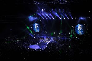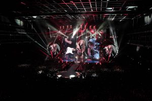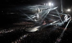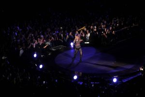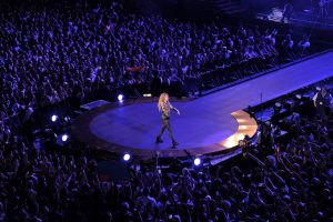 “ Hips Don’t Lie “ prend toute sa dimension sur scène et les déhanchés de Shakira ne sont définitivement pas une légende. Sexy mais jamais vulgaire, Shakira est à la fois la star planétaire qu’elle est mais aussi une artiste loin d’être une diva. S’installant au milieu du public, elle reprend dans une robe drapée “ Je l’aime à mourir “ de Francis Cabrel. Les univers s’enchaînent autant que les tenues et l’un des meilleurs tableaux est certainement “ Waka, Waka (This Time For Africa) “ où les écrans géants donnent une forme de démesure au show avec des armées de danseurs. Des pluies de confettis à plusieurs reprises mais aussi des flammes sur scène sont également de la partie et le public en prend plein les oreilles mais aussi plein les yeux. L’artiste s’impose définitivement sur scène et conquiert ceux qui restaient à l’être.