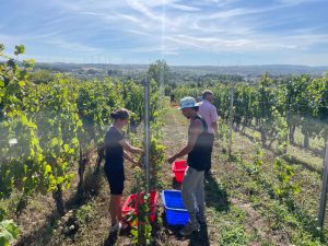 Vor der Kellerei der Domaine Kox sieht es am Dienstagvormittag anders aus als sonst: Maschinen, die für die Verarbeitung der Trauben benötigt werden, stehen im Hof, ein Lieferwagen einer spezialisierten Firma für die Wartung parkt vor dem Gebäude. Unser eigentlicher Termin mit dem Önologen war am Vorabend verschoben worden. Da wir dennoch jeden Mittwoch einen Beitrag zu unserer Serie veröffentlichen, musste eine Alternative her. Am frühen Morgen schrieb Winzerin Corinne Kox eine Nachricht: „Hallo Chris, mir starten haut an d’Lies.“ Das kam zwar überraschend, passte aber perfekt.
