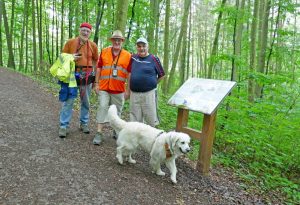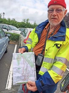 Verglichen mit der nationalen Wanderung ist die geführte Tour aufwandsmäßig doch ein Klacks. Nur zwei „Gelbwesten“ begleiten jedesmal die Gruppe. Da die Strecke anders als die nationalen Wanderungen nicht mit den an Baumästen, Sträuchern, Pfosten und Bänken befestigten roten Klebestreifen bzw. roten Plaketten des Wanderverbandes ausgezeichnet ist, könnten sich Nichtkundige verlaufen. Ist ein Teil der Gruppe schneller unterwegs, zieht er mit dem ersten Führer los. Der zweite, der eigentlich das Schlusslicht der Gruppe bilden soll, wird dann den Rest der Gruppe leiten, sagt Guy Antony.