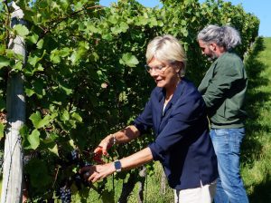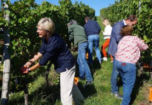 Konsbrück gab einen kurzen Überblick über den Stand der aktuellen Weinlese und sprach in seinen Ausführungen von einer herausragenden Qualität des Lesegutes. Mit Weinbergschere und Traubenbütte bewaffnet, begaben sich die Ehrengäste dann in eine Parzelle vom Domaine Keyser-Kohll zur Lese der St-Laurent-Trauben. In Windeseile waren sieben Bütten gefüllt und Frank Keyser hätte sicher keine Einwände gehabt, wenn die Gäste ihr emsiges Treiben fortgesetzt hätten.