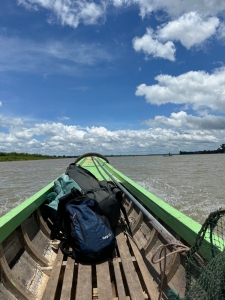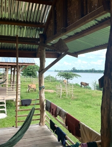 Ich wollte einen untouristischen Teil von Laos sehen und bin deshalb zu dem einzigen Gasthaus auf der Insel Don Nangloy im Mekong-Fluss gereist. Die Fahrt hierhin war ein kleines Abenteuer: Ich musste den Bus in Richtung der nächsten größeren Stadt nehmen und den Fahrer bitten, mich an einer Kreuzung auf der Hälfte der Strecke herauszulassen. Von dort hat mich ein Motorradtaxi zu dem kleinen Hafen gebracht, der aus einigen Holzbooten am Ufer des Flusses besteht. Mit einem dieser Boote wurde ich dann nach Don Nangloy gebracht. „Da rauf“, meint der Fahrer, als er einen Bambusstab in den Grund des Flusses rammt und das Boot vor einem dicht bewachsenen Hang stehen bleibt. Ich klettere diesen mit meinem Gepäck herauf und hüpfe über einen Zaun. Dann befinde ich mich endlich auf dem Grundstück des Gasthauses: auf einer Wiese mit einigen kleinen, hölzernen Bungalows. In einem davon werde ich zwei Nächte verbringen. Die Unterkunft ist einfach, aber hat alles Nötige: ein Bett, ein Moskitonetz, ein Fenster und einen kleinen Balkon mit Hängematte. Nur das Badezimmer ist etwas schwieriger zu erreichen: Es liegt auf einer Wiese, auf die man nur gelangt, wenn man erst einen Bambuszaun abmontiert. Als ich die Dusche einmal benutzen will, kommen mir gerade N. und J. aus Belgien entgegen. „Pass auf den Skorpion auf!“, ruft mir N. entgegen.