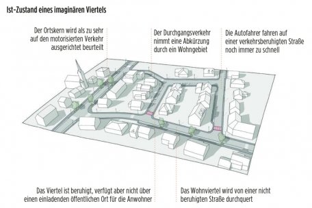 Der Durchgangsverkehr werde so auf Straßen geleitet, deren Aufgabe es ist, größere motorisierte Ströme zu absorbieren. Konkret heißt das, dass die Viertel wie „Taschen“ organisiert werden. Heißt: Das Viertel soll nur mit einer Verbindungsstraße verbunden sein. „Während der motorisierte Individualverkehr über die Verteiler- oder Verbindungsstraße in eine benachbarte ‚Tasche‘ fahren muss, machen Abkürzungen für Fußgänger, Radfahrer und öffentliche Verkehrsmittel diese Verkehrsmittel für kurze Wege innerhalb des Ortes attraktiver“, steht in der Leitlinie. Dadurch sei es dann möglich, 20er-Zonen innerhalb der Viertel einzuführen.