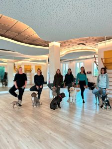 Während die Teilnehmer also Véroniques Posen, Bewegungsabläufe und Atemübungen durchführten, durften die Hunde sich unter Lynns Aufsicht frei im Raum bewegen und einfach nur Hund sein. Damit dies funktionierte, stellte Lynn den Interessierten im Vorfeld einige Fragen zum Charakter ihres Hundes, dessen Verhalten in Stresssituationen sowie seinem allgemeinen Zustand. „Wir haben uns dann auch erst mal auf neutralem Boden vor der Tür getroffen und sind auf eine Wiese gegangen, damit sich die Hunde kennenlernen konnten. Im Raum mussten sie zuerst an der Leine bleiben, bis ich sah, dass alle ruhig waren. Dann durften sie frei herumlaufen“, so Lynn.