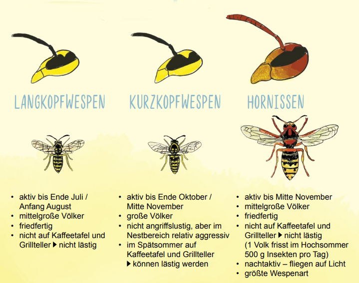 Dieser Überblick über die Wespen-Arten stammt aus der neuen Info-Broschüre des Vereins zum Thema, die hier als PDF heruntergeladen werden kann.