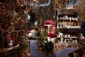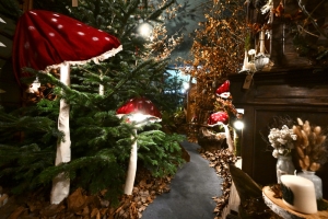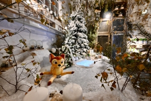 Und so geht es an den Weihnachtsbäumen und einem Klavier an der Eingangstür hinein in ein winterliches Märchenland, verteilt auf zwei Stockwerken. Im Erdgeschoss fließt ein kleiner Bach, der Boden ist mit Laub bedeckt, der Weg mit Wurzeln und Ästen dekoriert. An allen Ecken und Enden sind Themenbereiche eingerichtet. Über eine Treppe gelangt man in die erste Etage, die u.a. im Zeichen von Bambi steht. Dort hinein gelangt man durch eine Tür in Form eines riesigen Buches. Gleich nebenan liegt der Mickey-Maus-Saal. Überall sind Dekorationsartikel für die Weihnachtszeit zu finden.
