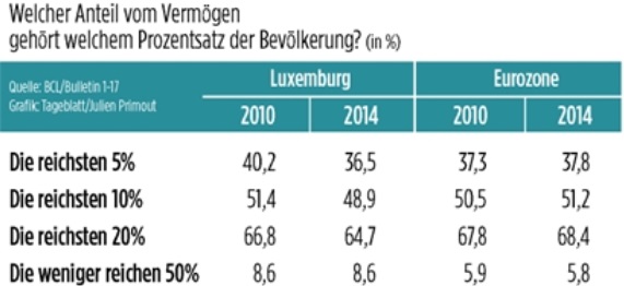 Dabei fällt auch auf, dass die Zahlen Luxemburgs „gleicher“ sind als in der Eurozone insgesamt. So hielt jemand, der zu den reichen zehn Prozent der Eurozone zählt, im Schnitt im Jahr 2014 insgesamt 503,8 Mal mehr Vermögen als jemand, der zu den übrigen 90 Prozent zählt. Jemand aus den 20 reichsten Prozent der Einwohner der Eurozone hatte im Schnitt 41 Mal mehr Vermögen als jemand aus den übrigen 80 Prozent.