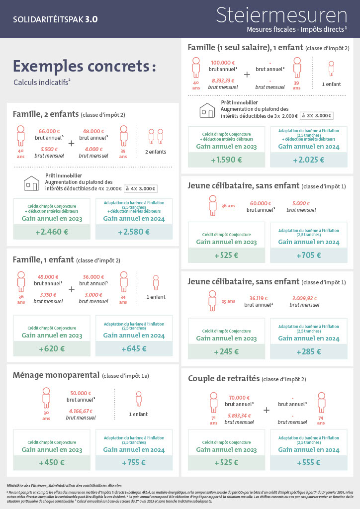 Das jüngste Ergebnis der jüngsten Tripartite namens „Solidaritéitspak 3.0“ soll vor allem Privathaushalte entlasten. Das Finanzministerium hat dazu am Donnerstag ein Dokument mit Rechenbeispielen veröffentlicht. Diese sollen zeigen, wie sehr Einwohner beziehungsweise in Luxemburg arbeitende Menschen von den beschlossenen Maßnahmen profitieren – unter anderem vom Steuerkredit in Höhe von zwei Indextranchen.