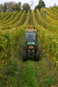 Ein Mitarbeiter bringt die prallgefüllten Bütten mit dem Traktor in den Betriebshof, während die Erntehelfer die letzten Rieslingtrauben vom Stock schneiden.
