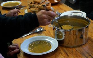 Wir fahren zum Betriebshof. Betriebsleiterin Corinne Kox delegiert hier schon den nächsten Arbeitsgang. Die am Vormittag geernteten Pinot-Blanc-Trauben werden allesamt entrappt und später, nach althergebrachter Tradition, mit den Füßen gekeltert. „Das machen wir aber nur mit den hochwertigsten Trauben“, erklärt uns der Winzer. „Das Auspressen der Trauben mit den Fußballen ist wesentlich schonender als mit einem herkömmlichen Kelter.“ Mit dieser Methode werden ein Maximum an Frucht, Gerbstoff und Farbe aus den Trauben gepresst, die Kerne bleiben jedoch unverletzt, sodass keine unerwünschten Bitterstoffe in den Wein gelangen. Das Team der Erntehelfer trifft im Weingut ein, mit dabei die letzten Rieslingtrauben. Laurents Gattin Rita bekocht hier jeden Mittag die Mannschaft mit deftiger Kost. Das eingespielte Team arbeitet seit mehr als zehn Jahren für das Weingut und freut sich täglich auf Ritas Kreationen. Heute gibt es Erbsen-Linsen-Eintopf aus dem dampfenden Topf mit selbstgebackenem Focaccia und natürlich auch einem Glas Wein dazu. Die Stimmung bei Tisch ist ausgelassen, noch einmal in den Wingert, dann ist die diesjährige Ernte beendet. Warten wir also gespannt auf das, was im nächsten Jahr in die Flasche kommt.