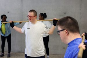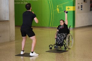 Die 33-jährige Cynthia hat ihr Unterbein vor zwei Jahren bei einem Motorradunfall verloren und nun eine Prothese. Als eine der Beinübungen, die an diesem Samstag auf dem Programm stehen, nicht möglich scheint, beraten sich die Trainerin und die Sportlerin kurz, ehe Cynthia mit einer leicht abgewandelten Version beginnt. Bei der nächsten Übung wird der Bewegungsablauf für die im Rollstuhl sitzende Melanie geändert. Die anderen Teilnehmer warten jeweils geduldig auf die Absprachen oder beginnen die eigenen Durchläufe, wenn sie die Übung schon kennen. Niemand wird offensichtlich ungeduldig, wenn mal eine Unterredung kurz länger dauert oder jemand das Training nicht so schnell absolviert wie andere. „Der Vorteil von den kleinen 12er-Gruppen ist, dass man sich auf jeden Einzelnen konzentrieren kann.“