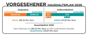 Mehr als die Hälfte der ordentlichen Ausgaben fürs kommende Jahr entfällt wie gewohnt auf das Personal: Rund 514,57 von 921,30 Millionen Euro sind in dem 451 Seiten umfassenden Haushaltsplan dafür vorgesehen. Zunehmend mehr Personal (4.721 Angestellte) soll auf den 1. November 2026 dafür sorgen, dass bei den kommunalen Diensten alles glattläuft. Zum Vergleich: Ein Jahr zuvor umfasste das Personal 4.588 Personen. Für die Arbeit der Politik sind auch in diesem Jahr wieder mehr als eine Million Euro eingeplant: darunter 504.800 Euro für die Aufwandsentschädigungen der sieben Mitglieder des blau-schwarzen Schöffenrats und 60.000 Euro für die Präsenzjetons der 27 Ratsmitglieder.