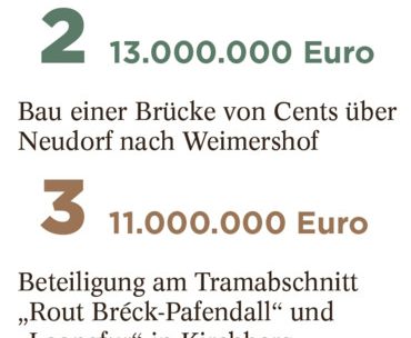 Rund 13 Millionen sollen 2026 in den Bau einer umstrittenen Brücke für die sanfte Mobilität fließen, die Cents mit Weimershof verbinden und über einen Lift auch Neudorf erschließen soll. Insgesamt wird das Projekt auf 40,1 Millionen Euro veranschlagt. Mit 11 Millionen Euro beteiligt sich die Stadt 2025 zudem erneut am Tram-Ausbau auf dem Kichberg – konkret am neuen Abschnitt von „Rout Bréck-Pafendall“ zum Stadtteil „Laangfur“. Auf der 2,3 Kilometer langen Verlängerung wird es drei neue Haltestellen geben. Zusammen mit weiteren Ausgaben für neue Streckenabschnitte im Stadtteil „Nei Hollerich“, an der route d’Esch sowie für ein Depot auf Cloche d’Or summieren sich die Investitionen in die Tram auf 13,3 Millionen Euro.