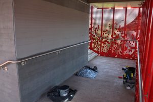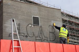Auf einmal ging doch alles schneller als ursprünglich geplant: Nicht erst im September, sondern am Tag nach der Berichterstattung des Tageblatt über Nazi-Symbole stehen am frühen Donnerstagmorgen bereits mehrere Personen in Sicherheitswesten und Uniformen beim Aufzug des „Vëlodukt“. Eine Leiter ist aufgestellt und ein Mann wischt dort, wo vorher noch das Hakenkreuz zu sehen war. Später wird die Stelle mit grauer Farbe übermalt.