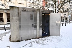 Wer heute muss, der lässt sich schlecht auf morgen vertrösten. Also folgt er dem Pfeil, der auf eine 10 Meter vom Rathaus entfernt gelegene Toiletten-Box zeigt: „öffentliche, selbstreinigende Toiletten“, wie diese eher unästhetischen Kästen genannt werden. „Maximale Nutzungszeit: 15 Minuten“ steht auf einem Hinweisschild zu lesen. Na ja, länger sollte das Geschäft auch nicht dauern. Allerdings muss die Frage erlaubt sein, was nach einer Viertelstunde passiert. Öffnet sich dann die Tür automatisch? Oder bleibt sie, wie der Kollege vermutet, verschlossen, bis der nächste Kunde kommt?