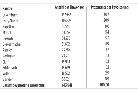Die Gemeinde Luxemburg ist mit 128.097 Einwohnern bei weitem die bevölkerungsreichste – das repräsentiert immerhin ein Fünftel der Gesamtbevölkerung. Auf Platz zwei steht Esch/Alzette mit 36.117 Einwohnern und Differdingen auf Platz drei mit 28.532 Bewohnern. Die bevölkerungsärmste Gemeinde ist hingegen Saeul mit 960 Einwohnern, gefolgt von Wahl (1.043) und Pütscheid (1.127).