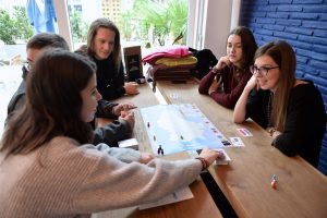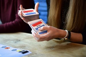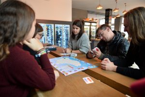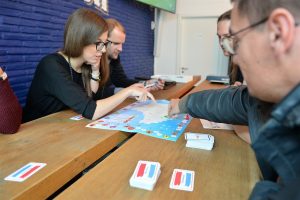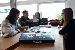 Unbeirrt legt sie den grünen hölzernen Pfeil in der Gemeinde Wintger, Kanton Clerf, ab. Drei Punkte für die richtige Stelle, einen für den richtigen Kanton und einen für die richtige Gemeinde. Ihre pinke Spielfigur darf fünf Felder nach vorne rücken. Ein Erfolgserlebnis. Kurz danach folgt aber schon der erste Rückschlag. Sie landet auf dem Frage-Feld. Ihr linker Nachbar zieht eine Quiz-Karte und liest die Frage vor: „Wéi vill Mariagë goufen 2015 zu Lëtzebuerg gescheet?“ Es gibt drei mögliche Antworten. Sie verschätzt sich und muss fünf Felder zurück. Nervöses Lachen im Raum: „Das ist aber ein wenig übertrieben“, sind sich alle einig.