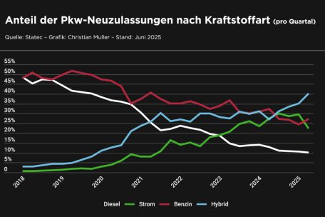 Über eine ähnliche Entwicklung hat die Nachrichtenagentur AFP zuletzt auch aus Deutschland berichtet. Auch hier hatten die Hybriden, mit 38,6 Prozent, im Juni den größten Anteil an den Neuzulassungen. 28,5 Prozent der Neuzulassungen entfielen auf Benziner, 18,4 Prozent auf E-Autos und 13,9 Prozent auf Diesel.