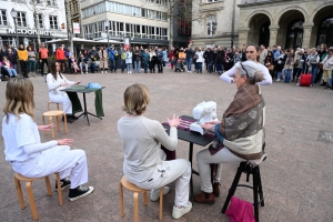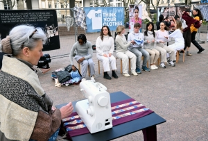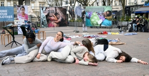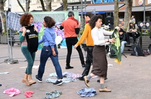 „Bis heute wissen wir nicht, wie viele Menschen ganz genau dabei gestorben sind“, stellte Marc Crochet, Generaldirektor von Caritas Luxembourg, nach der ergreifenden Darbietung fest. Kurz zuvor hatten dabei rund zehn Freiwillige zu düsterer Musik den kräftezehrenden Alltag der Angestellten in Textilfabriken auf tänzerische Art und Weise dargestellt – an vier auf dem Platz aufgestellten Nähmaschinen und unter dem strengen Blick ihres Vorgesetzten. Dem gegenüber wurde im Verlauf der Choreografie von Nora Hoffmann der übermäßige Konsum an Billig-Kleidern („fast fashion“) in den westlichen Ländern gestellt.