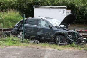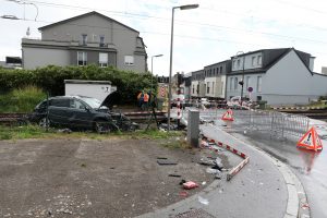 Eine Autofahrerin blieb am Montag kurz vor 14.00 Uhr zwischen den beiden Schranken des Bahnübergangs in Bartringen stecken – kurz darauf erfasste ein herannahender Zug das Auto und schleuderte es mehrere Meter weg. Die Fahrerin konnte noch rechtzeitig aus dem Wagen aussteigen und sich in Sicherheit bringen.